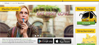 Haben Sie aktuell eine Busreise mit Fernbus und Familie angedacht? Das Angebot der Fernbusse in Deutschland ist ja recht neu. Auch wer mit Kindern unterwegs ist, sollte zumindest einmal checken, ob sich die Fahrt mit dem Bus für die eigene Pläne lohnt und praktisch ist (Entscheidungshilfen dazu hier). Für Kids und Eltern hilft da vielleicht noch eine weitere Info: Im ADAC Postbus können sich große und kleine Reisende mit einem Entertainment-Programm auf dem eigenen Handy oder Tablet die Reisezeit vertreiben. Im sogenannten Media Center laden sich große und kleine Reisende auf der Busfahrt Filme, Hörbücher und Musikangebote einfach aufs Smartphone oder iPad herunter. Das kostet nichts extra, da alle Postbusse über kostenloses W-Lan verfügen. So ist der Nachwuchs auf der Fahrt beschäftigt und fühlt sich fast wie im Flugzeug mit Bordprogramm. Was gibt es zu sehen? Ein aktuell wechselndes Programm: Für die Kids zum Beispiel den Film Toy Story III, Die Monster Uni oder für Kleinere Happy Feet II. Für Mama ist dann hoffentlich Entspannung und Sitzkomfort genießen angesagt: Vielleicht mit Männerherzen II oder Two and a Half Men vor den Augen? Gerade gibt es außerdem Eat Pray Love mit Julia Roberts in der Hauptrolle. Oder die Erwachsenen amüsieren sich mit Hörbuchern wie zum Beispiel Hape Kerkelings „Ich bin dann mal weg“ auf den Ohren. Jugendliche können übers eigene Handy Musik beispielsweise von Pink, David Guetta oder Frida Gold hören. Was ist bei der geplanten nächsten Busfahrt gerade im Programm? Aktuelle Infos dazu: Programminfos Mediacenter