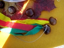 Nun haben wir eine Kastanie mit Schwänzchen, die prima durch die Luft fliegt. Fortgeschrittene bohren vorsichtig noch ein Loch in die Kastanie, ziehen durch dieses Loch eine ungefähr 40 cm lange Schnur, verknoten diese und haben: eine Kastanienschleuder. Was ihr damit alles machen könnt? Findet es selber heraus! Ich sage nur: „Vorsicht vor Bäumen!“ und vor Wasser, da löst sich die ganze Pracht nämlich schnell auf. Ist ja klar, ist ja auch dünnes Papier.