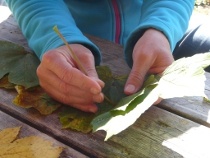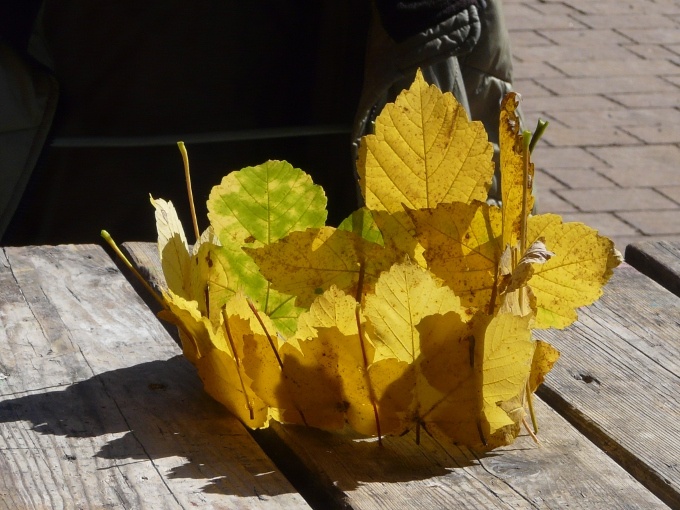 Wir sammeln 6-8 noch nicht so trockene Ahornblätter, je nach Größe der Blätter und nach Größe des zu bekrönenden Kopfes. Die Stängel knipsen wir mit der Hand oder einer Schere, ab. Nun legen wir die Ahornblätter überlappend vor uns hin. Es gibt verschiedene Überlappungsformen, jeder wie er mag.