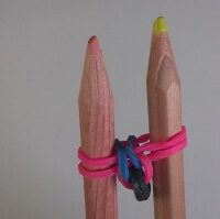- Stifte parallel halten. Erstes Gummiband verdrehen und als eine „Acht“ um die Stifte legen.